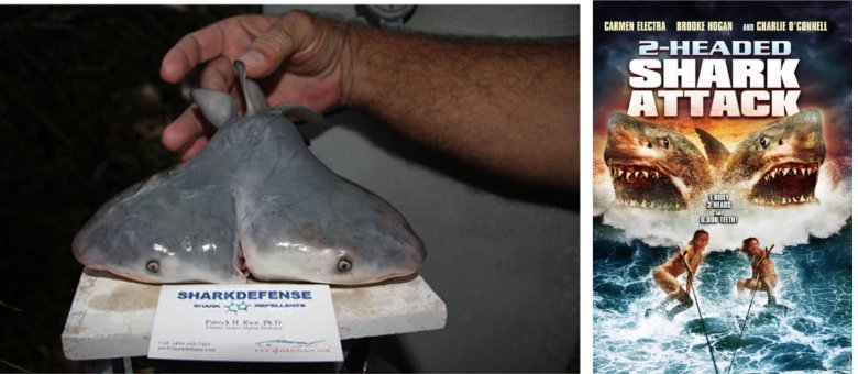 A arte pode imitar a vida, mas a vida precisa parar com esse negócio de querer imitar filme trash. A descoberta aconteceu em abril de 2011, mas só foi divulgada agora, depois que os cientistas perceberam que é a primeira vez que eles acham um tubarão de duas cabeças que não é, na real, dois tubarões gêmeos que nasceram grudados.